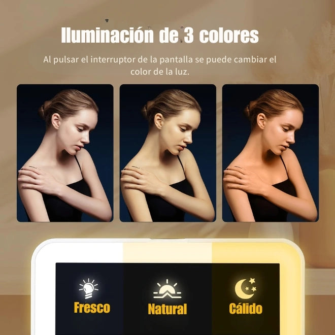 - Iluminación LED: Espejo integrado con luz LED de 3 modos (cálida, fría, natural) y brillo regulable.